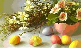 listkach, którą dodaje się do jajek, białego sera czy masła. Tradycja polska każe ugotowane i obrane ze skorupek jajka włożyć do koszyczka świątecznego. Na dnie koszyczka kładzie się białą serwetkę, a na niej układa jajka, kawałek chleba, kiełbasy, chrzan, pieprz, sól oraz baranka z chorągiewka i czerwoną wstążka na szyi. Baranek może być wykonany z ciasta, cukru, czekolady, ale musi się znależć w koszyczku, zwanym święcone lub święconka, ponieważ symbolizuje zmartwychwstałego Jezusa. Wierzch koszyczka przykrywa się najpiękniejsza białą serwetką i przyozdabia borówkami. W Wielka Sobotę rano koszyczek zanosi się do kościoła do poświęcenia. Na stole wielkanocnym nakrytym śnieżnobiałym obrusem stawia się święconkę w Wielką Niedzielę, kiedy to śniadanie wielkanocne rozpoczyna przepiękny i podniosły zwyczaj dzielenia się poświeconym jajkiem, któremu towarzyszą życzenia zdrowia, szczęścia, miłości przekazywane rodzinie. Podobnie czynimy w Wigilię Bożego Narodzenia, gdy dzielimy się opłatkiem.